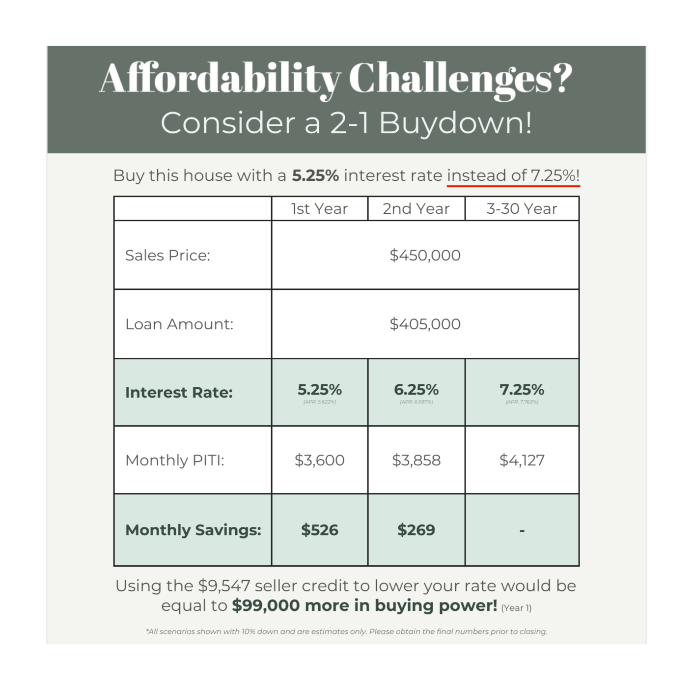 With rates being the highest they’ve been in 2 decades, affordability can be a real challenge! A 2-1 Buydown is one of the many tactics that I can use to help make buying more affordable. Take a look at how the numbers shake out when you’re able to buy your rate down, and lets chat if this is something you’d like to look in to!